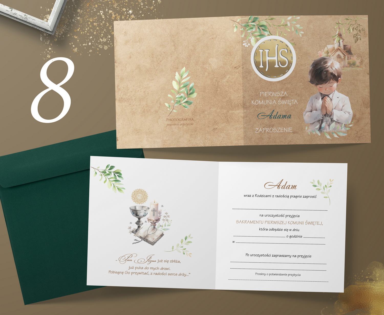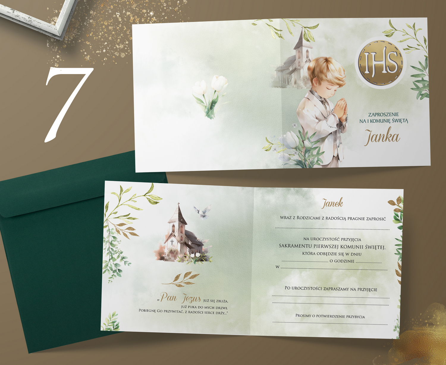 Wzory zaproszeń na Komunię Boy akwarela II 3D IHS
