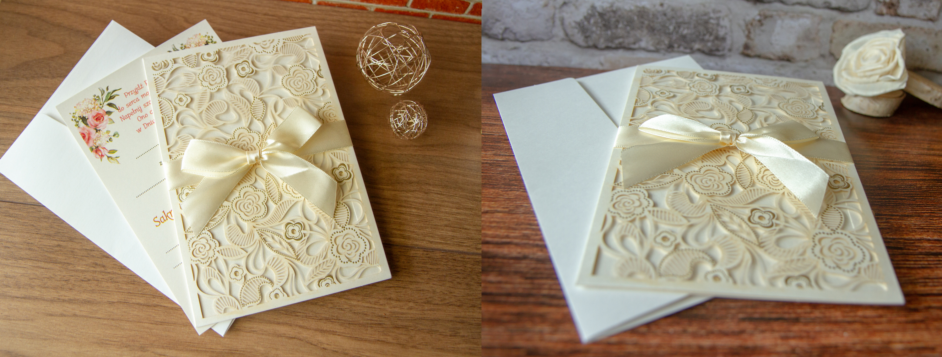 Niepowtarzalne, zaproszenia z wycinaną laserowo okładką. Okładka dodatkowo jest miejscowo złocona.