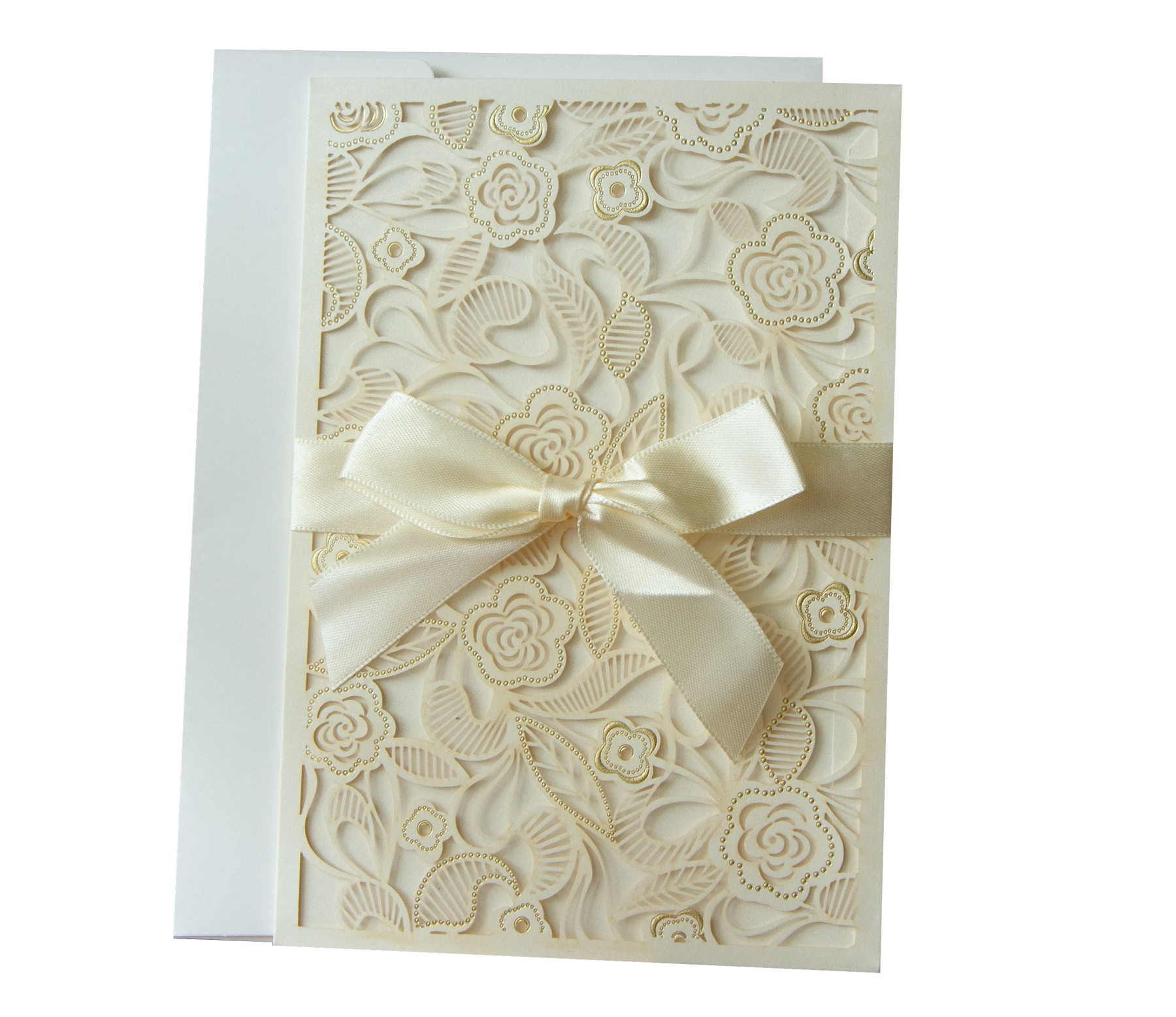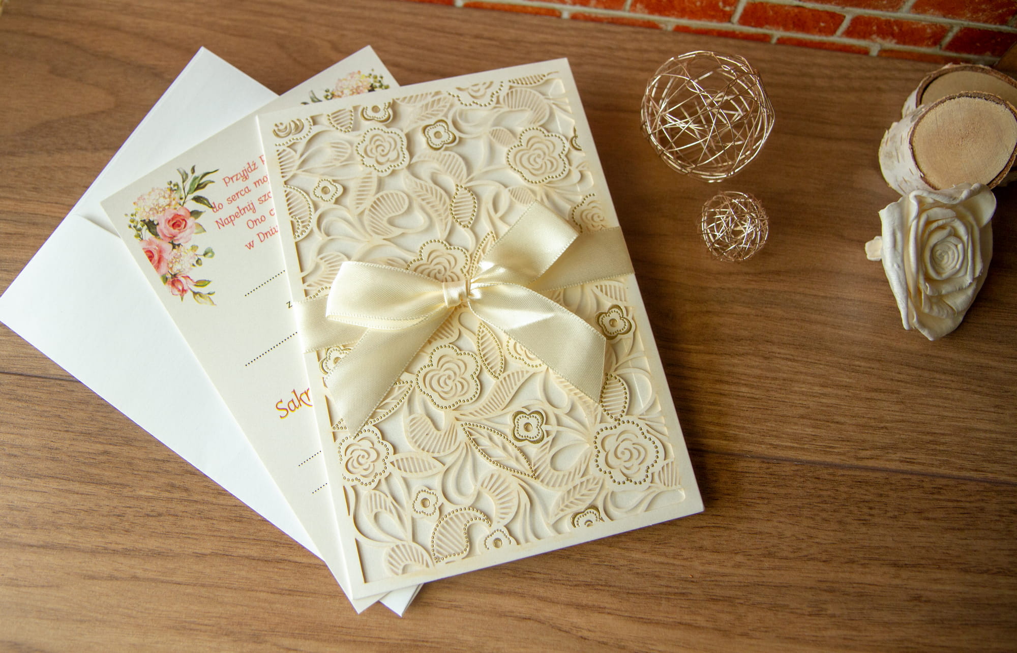 wycinanej laserowo okładki, wkładki z tekstem, zawiązanej wstążeczki z taśmą klejącą i koperty.