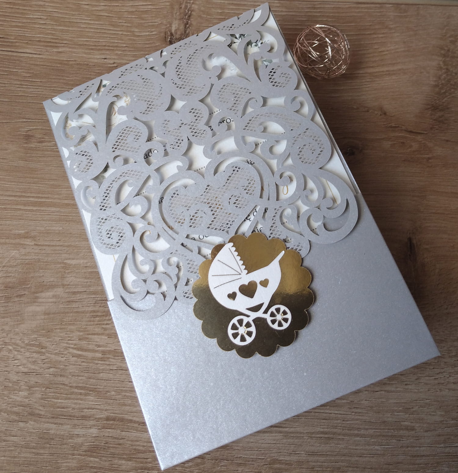 wycinanej laserowo okładki, wkładki z tekstem, laserowo wycinanego elementu 3D i białej koperty.
