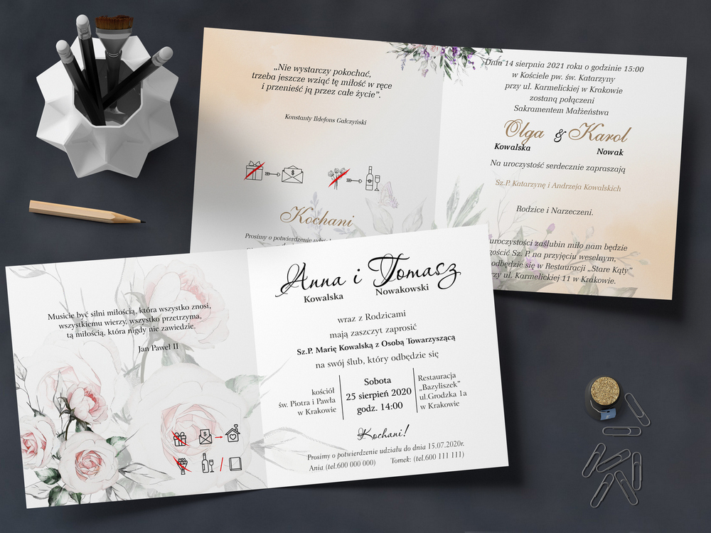 - Zaproszenia mogą być także do samodzielnego wypisania Gości, miejsca, daty (wykropkowane).