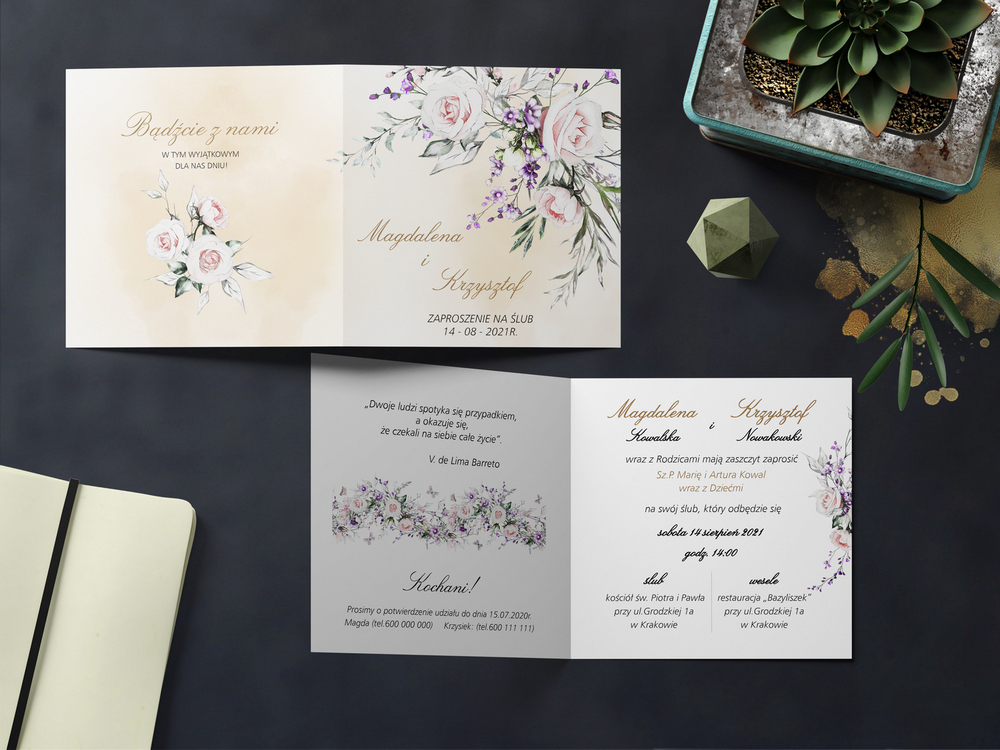 Rozkładane zaproszenia drukowane na: