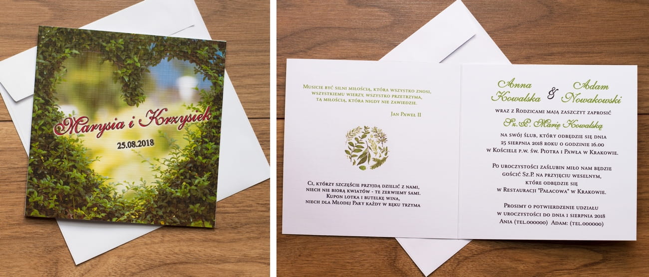 - Możliwość wyboru tekstu do wnętrza zaproszenia lub przesłanie własnego.